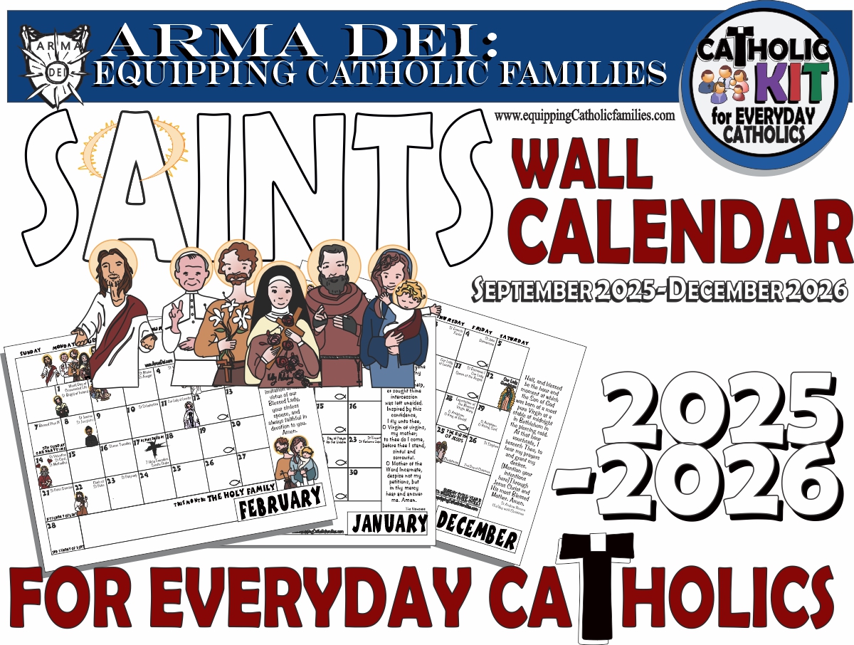 This Wall Calendar Kit includes a 16 month calendar including September 2025-December 2026 (illustrated with the Kelly Saints on key Feast Days!) formatted to fit 8.5″x11″ landscape mode.