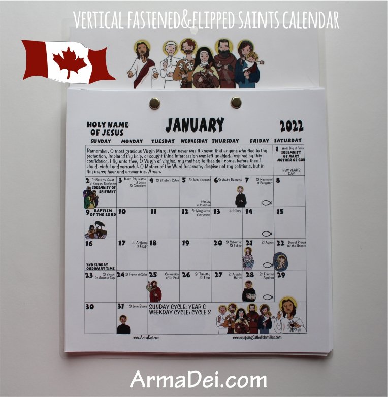 The 2022 Saints Vertical Wall Calendar includes a 12-month calendar (illustrated with the Kelly Saints on key Feast Days!) fastened to a laminated 8.5″x11″ backing featuring Jesus, St. John Paul II, St. Joseph, St. Therese, St. Padre Pio and Mother Mary.