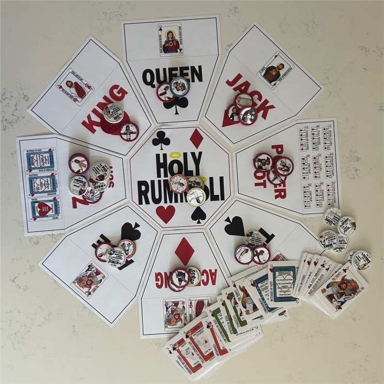 The Holy Rummoli! craft kit includes the 9 classic Card and Combo spaces, along with 8 additional custom Cathletics Card and Combo spaces, arranged to create the table-top Rummoli game.