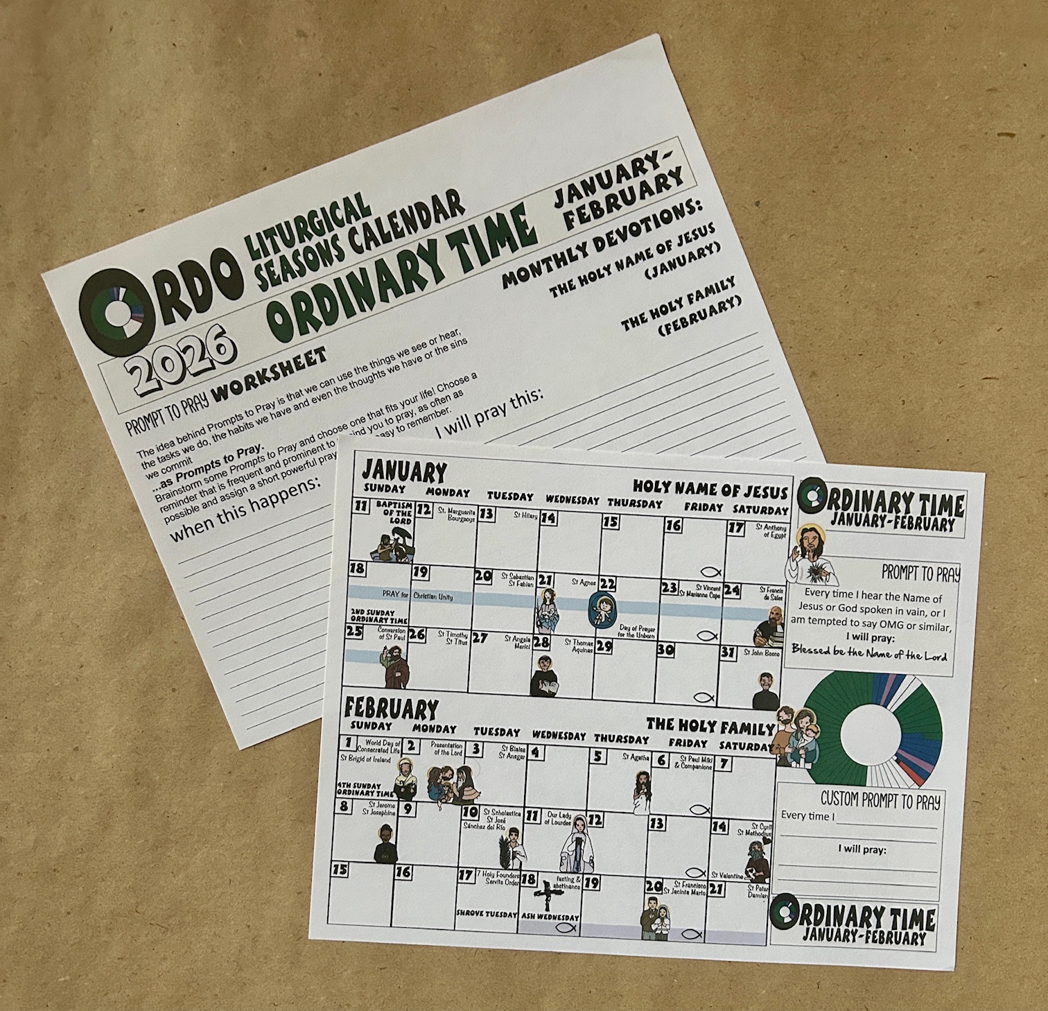 ORDO: Ordinary Time presents the first 5.5 week span of Ordinary TIme from January 11-February 17 (Pancake Tuesday) with illustrated Saints Feast Days and prayer prompts for the Monthly Devotions of The Holy Name of Jesus (January) and The Holy Family (February).
