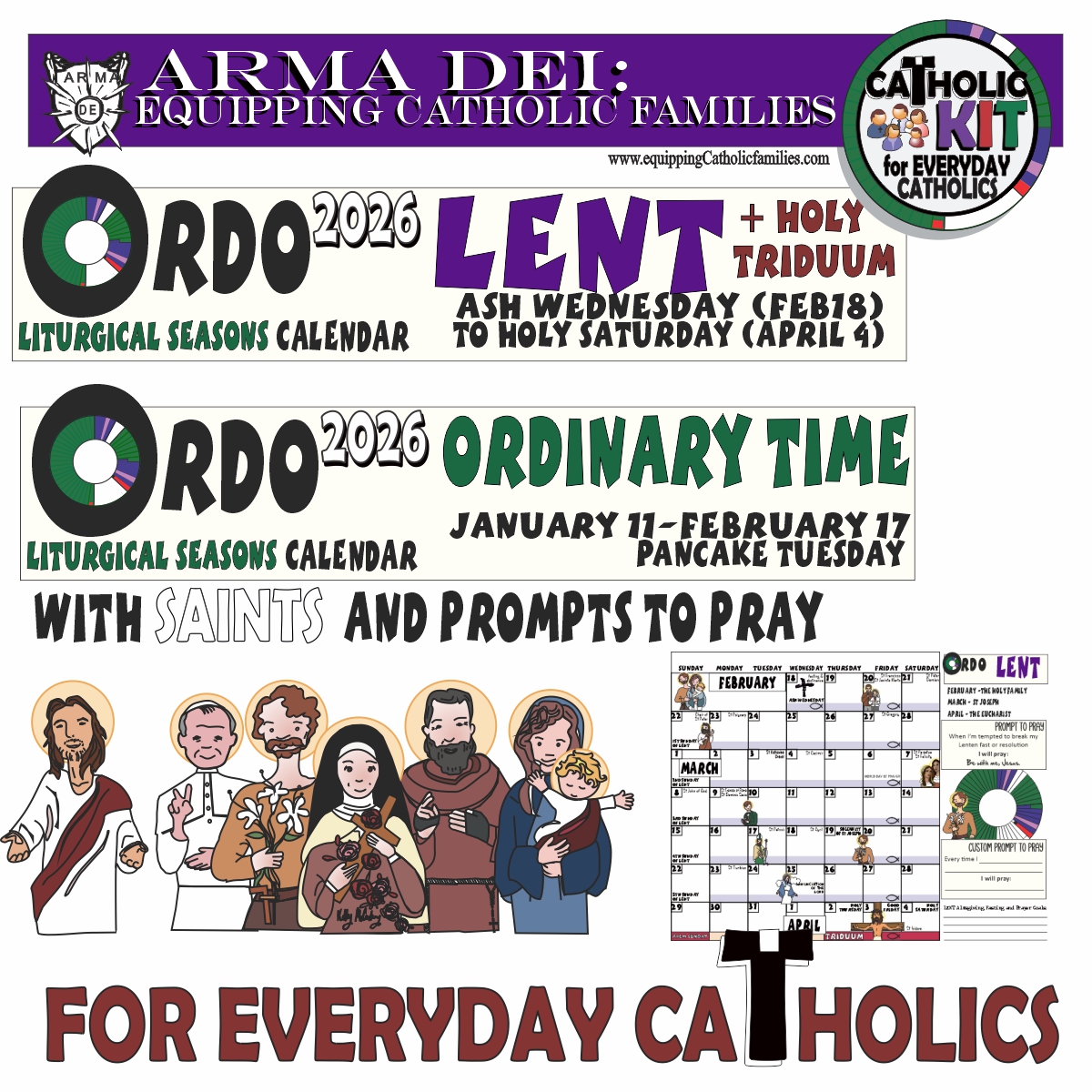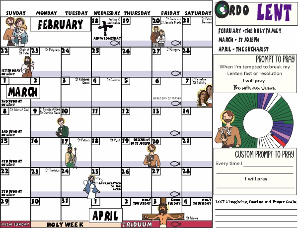 ORDO: LENT presents the 6 weeks from February 18 to April 1st (Ash Wednesday to the Wednesday of Holy Week), plus the Triduum of Holy Thursday, Good Friday, and Holy Saturday. This calendar is illustrated with Saints Feast Days, marked with days of fasting and abstinence and offering prayer prompts for the monthly devotions of the Holy Family (February), St Joseph (March) and The Eucharist (April).