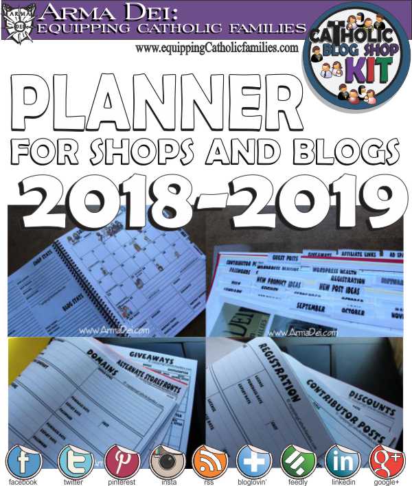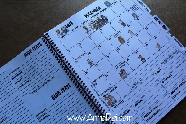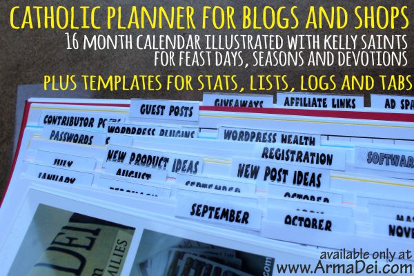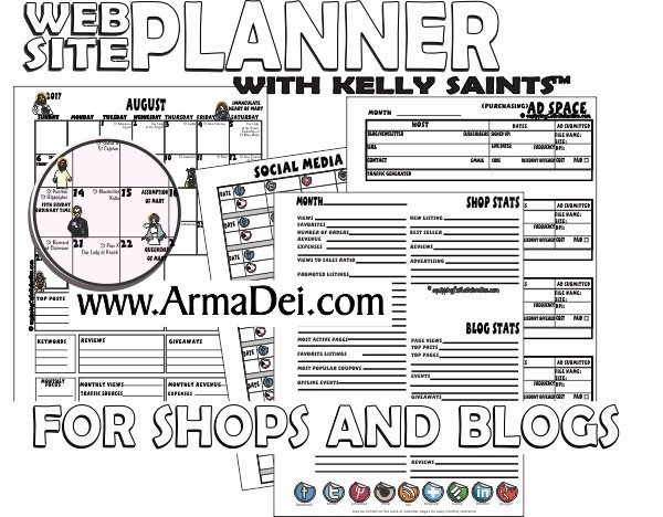 The Website Planner includes a 16 month calendar (illustrated with the Kelly Saints on key Feast Days!), along with website, blog and shop planner stats and records. It starts with September 2018  and includes over 40 full-page templates! Added this year: Template of add-ons: Lists and Logs for Sacraments and Prayer Intentions
